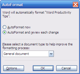 Select the “AutoFormat” tab and you’ll all the options that can be automatically applied. Once you selected all the changes you want to apply, close that window and hit “Alt+O+A”. Here’s a window that opens up once you do that: